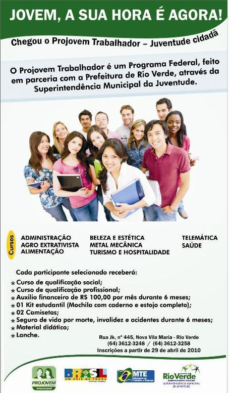 A Prefeitura de Rio Verde, através da Superintendência Municipal de Juventude (SMJ), irá lançar no próximo dia 18 às 19h, no Salão Social do Sindicato Rural, o programa Projovem Trabalhador – Juventude cidadã, com objetivo de qualificar profissionalmente 2 mil jovens em Rio Verde.