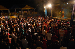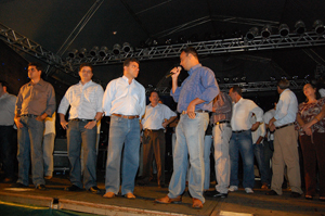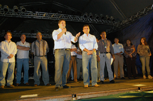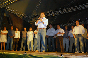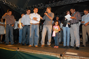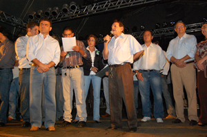 O vice-prefeito ainda anunciou a aquisição de uma balança para o Distrito. “Ela será instalada em breve e servirá a todos os produtores, seja para pesagem de gado ou da safra”, disse. Também participaram do evento os Secretários Municipais: Heuler Cruvinel (Governo), Geraldo Ribeiro de Carvalho (Agricultura), André Luiz Abreu Ferreira (Transporte), Guilson Rodrigues (Indústria e Comércio), Fernando Pazotti (desporto e Lazer), além de Manoel Francisco da Silva (subprefeito de Lagoa do Bauzinho), João Carlos (subprefeito de Riverlândia), dos superintendentes Walter Honório da Silva (Trânsito) e dos vereadores: Iran Mendonça Cabral, Eliene Medeiros, Luís César, Mara José e James Borges, que representou o presidente da Câmara Elecir Casagrande. A solenidade foi declarada aberta pelo subprefeito Manoel Francisco da Silva. Logo após, Heuler Cruvinel ressaltou a importância da festa e destacou os números que movimentam este evento. “Ao todo, são 10 produtores de melancia que, juntos produziram, em uma área de 105 hectares, mais de 4.500 toneladas do fruto, gerando 120 empregos diretos”, observou. Segundo o Secretário, por tudo isso a Lagoa está em festa, já que completa mais um ciclo da safra com muito sucesso. “É um grande prazer ver a casa cheia para prestigiar este grande evento. No ano que vem, queremos fazer uma festa ainda mais grandiosa, com todo apoio que ela merece, em um local próprio que iremos construir”, anunciou. Após os discursos, a banda Rosas do Vento animou a galera que lotou a festa com um repertório vasto e variado. Lembrancinhas – E para quem vem de fora visitar a festa, não faltam opções de lembrancinhas que fazem referência a Rio Verde, ao Município e, principalmente, à melancia. Entre os artesanatos feitos em panos de pratos, arte em vidros e recicláveis, destaca-se a grande variedade gastronômica de produtos diversos feitos com a melancia. Segundo Nilza Antônia Rodrigues da Silva, coordenadora do estande da Prefeitura, o mais procurado este ano tem sido o licor de melancia, que é novidade. “Mas também tem muita saída todos os doces, os cristalizados, o de leite com a casca da melancia ralada, as cocadas, entre tantos outros”. Conforme destaca, o movimento este ano tem atingido à expectativa. “Já recebemos visitantes aqui de diversos lugares do mundo, como São Paulo, Goiânia, Brasília e Tocantins. Eles vêm especialmente para a festa e se encantam com tanta novidade”, ressalta. Mais do que os doces, bijuterias e brinquedos também se fazem presentes nas barraquinhas. Este ano, outra grande novidade foi o estande da Câmara Municipal de Rio Verde, montado no local para melhor atender à comunidade. A iniciativa foi elogiada pelo vice-prefeito Demilson Lima, que agradeceu a parceria e cumprimentou a Casa de Leis pela excelência do trabalho prestado. “Esta é a consolidação da parceria existente entre Executivo e o Legislativo em Rio Verde e mostra o fruto da responsabilidade da Câmara Municipal”, enalteceu. Fotos: Cairo Fagundes Demilson Lima e Heuler Cruvinel evidenciam a importância da festa para a economia local Ver.James Borges fala em nome da Câmara e produtores agradecem apoio da Prefeitura Subprefeito Manoel Catarina declara aberta a grande festa e público assiste ao da Rosas do Vento