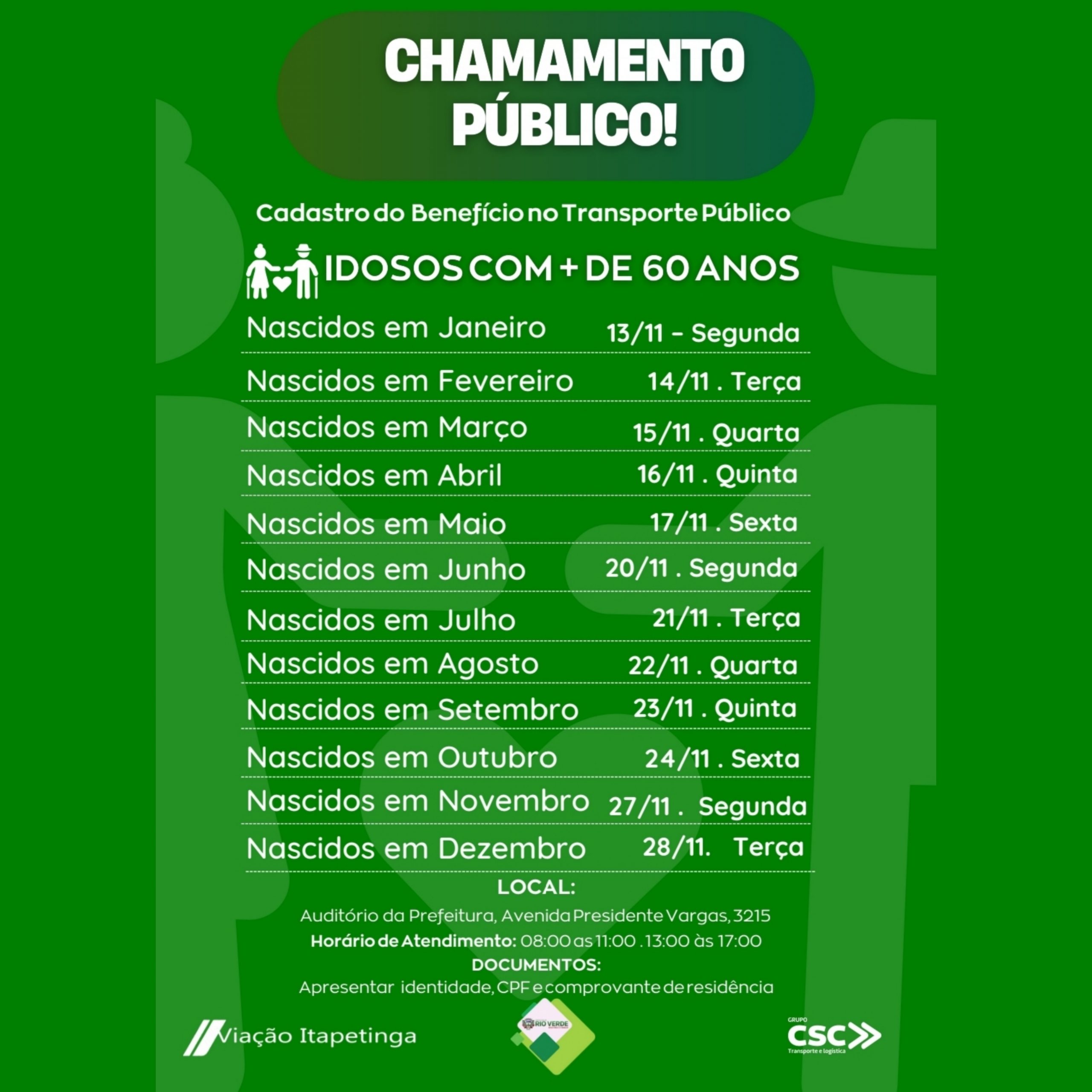 Atenção, moradores de Rio Verde! A Prefeitura Municipal, em parceria com a Via-ção Itapetinga/CSC Transporte e Logística, anuncia o período de cadastramento para a gratuidade no novo Sistema de Transporte Público Coletivo destinado a pessoas a partir de 60 anos.