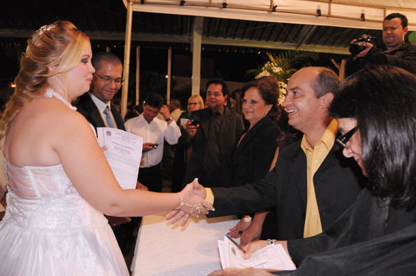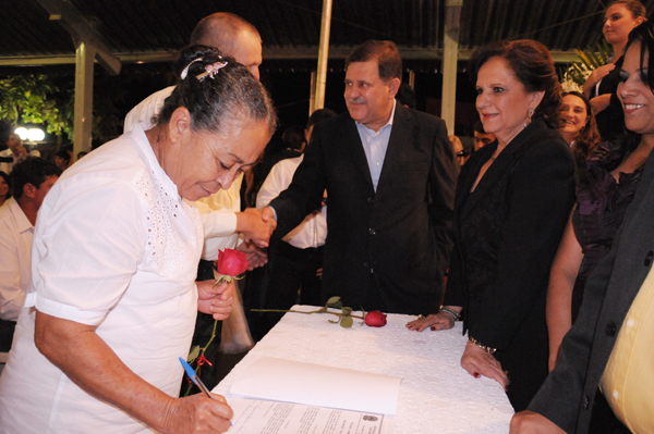 A solenidade teve início com a entrada dos casais, que receberam a certidão, oficializando, de maneira definitiva, o matrimônio. A celebração foi realizada pela juíza de paz, Ozânia Vilela de Oliveira, que falou da importância do casamento e da vida em família. Participaram também do casório: o Prefeito Juraci Martins e a secretária de Promoção Social e primeira-dama do município, Clarice Martins, casal que, no ato, amadrinhou os noivos. Além, do o vice-prefeito e secretário de Ação Urbana, Demilson Lima, o subprefeito da Lagoa do Bauzinho, Paulo César da Silva, os vereadores Elecir Casagrande e Iran Cabral, representando do Legislativo rio-verdense, entre outros secretários municipais e gestores. A secretária Clarice Martins ressaltou que aquele momento era dos noivos, que estavam dando um importante passo rumo a dar mais um sentido na vida em família. “O que importa aqui hoje é a união de vocês. Nossos votos são de muita paz e harmonia aos casais. O objetivo da Prefeitura, ao realizar esse casamento comunitário, é oferecer o documento oficial para as famílias de baixa renda que não tem condições de custeá-lo no cartório”, comentou. Já o prefeito Juraci Martins explicou a importância do evento. “O intuito é regularizar a união daqueles casais que vivem informalmente ou realizar o sonho dos que estão se casando pela primeira vez. Os votos são de muitas felicidades e que vocês vivam em paz”, explicou. O subprefeito Paulo César, disse o que achou de o distrito ter recebido o casamento. “O apoio que nos foi dado, por parte da Prefeitura, foi de extrema importância para que o evento se tornasse realidade. Hoje é dia de festa por ver tantos amigos unidos em matrimônio”, enfatizou. O casal Cleiciane Alves Ferreira e Adeir Carmo Gomes, que vivem juntos há quatro anos, disseram que o casamento formal é de extrema importância para os dois. “A partir de agora, teremos um documento oficial como prova de que vivemos juntos. Como não temos condições de custear essa união no cartório, decidimos participar do casamento comunitário”, explicaram.Outro casal que também decidiu participar do evento foi Elza Francisca Bastos e Antônio Ramos da Silva. Para eles, a realização do casamento no distrito foi o principal incentivo para que os dois decidissem regularizar o matrimônio. “A juíza se deslocar até aqui facilitou muito. Caso contrário, teríamos que nos dirigir até Rio Verde para casar no cartório. Essa oportunidade é ótima, pois já vivemos juntos há alguns anos e agora teremos um papel oficial para provar que somos casados”, finalizou.