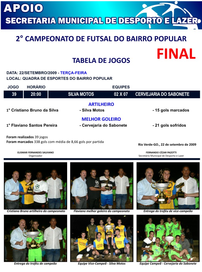 Logo no início da partida, a equipe da Cervejaria do Sabonete dominou o jogo, levando assim o troféu de campeão do campeonato. Veja o resultado: