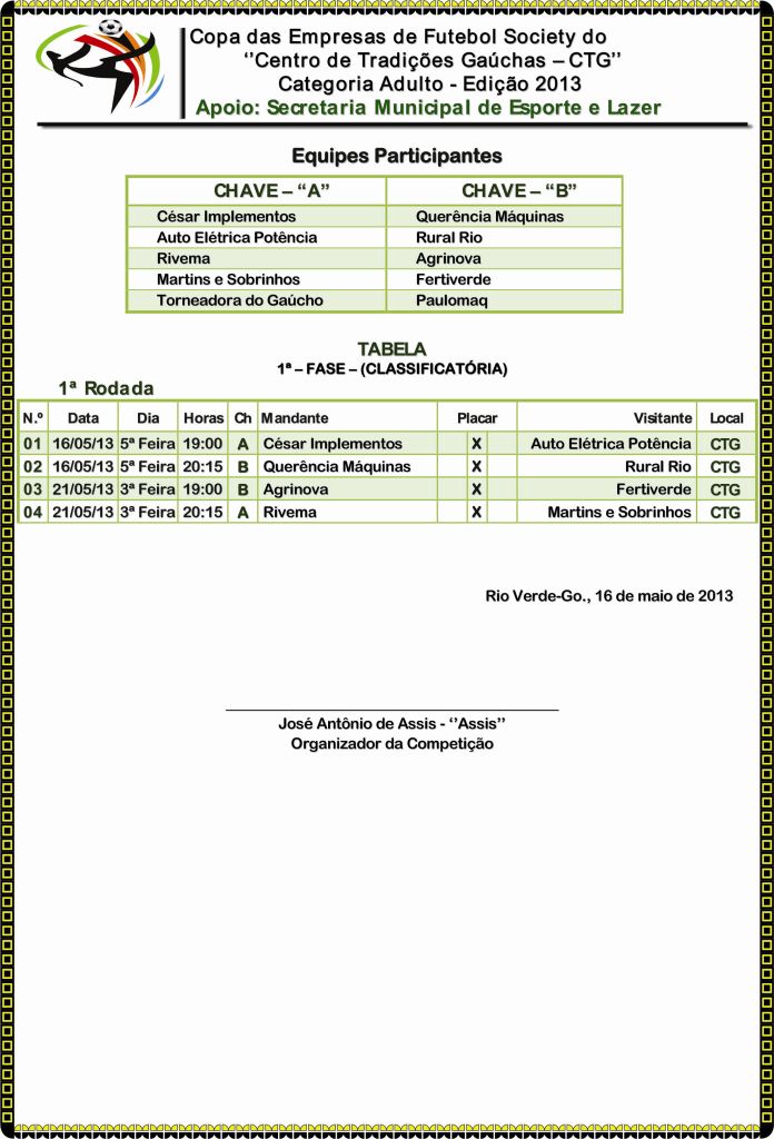 Confira a tabela de jogos da Copa das Empresas de Futebol Society do “Centro de Tradições Gaúchas – CTG”