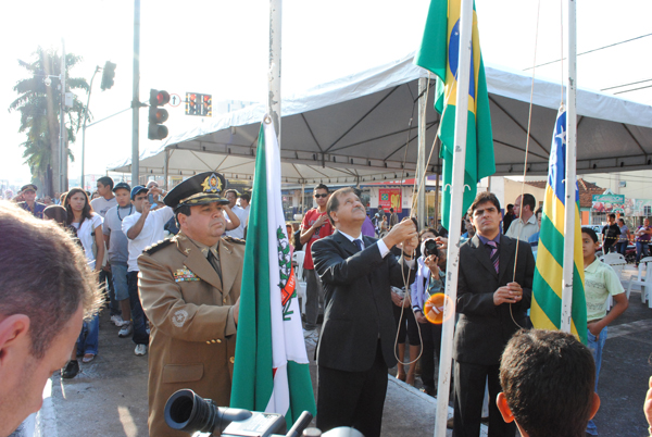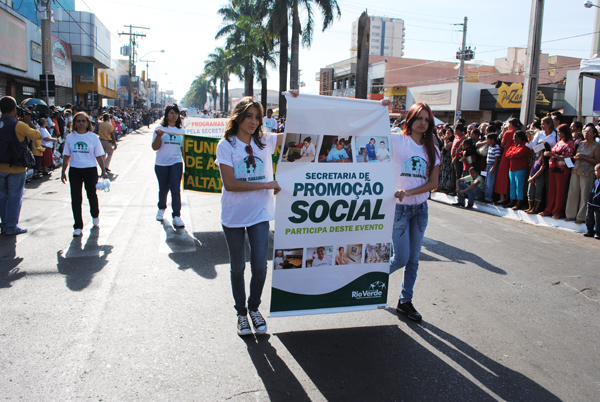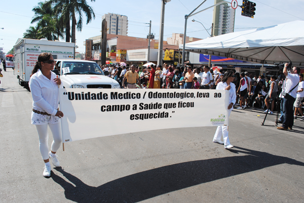 O tradicional desfile em comemoração aos 162 anos de Rio Verde foi iniciado às 8h desta quinta-feira, 05. Dando início ao evento, o prefeito Juraci Martins, o vice-Presidente da Câmara Elias Terra e o Comandante do 8º Comando Regional de Policiamento Militar (CRPM) Coronel Macário hastearam as bandeiras do Brasil, de Goiás e de Rio Verde. Cerca de 5 mil expectadores presenciaram o desfile, entre eles várias autoridades políticas municipais, estaduais e militares. A Prefeitura preparou para esta ocasião uma bandeirinha de Rio Verde com o hino a Rio Verde, fazendo assim a alegria da meninada. O destaque do evento foi o momento em que o prefeito Juraci Martins fez a entrega simbólica de duas viaturas para o Corpo de Bombeiros que serão utilizadas para o Combate de Incêndios Florestais, nesta entrega foi investido o valor de R$1 milhão de reais. Mais de 3.000 pessoas e 60 empresas integraram o desfile, mas o diferencial deste ano foi à presença da Banda do Batalhão da Guarda Presidencial Municipal (BGP) e do Pelotão de Ordem Unida dos Granadeiros do BGP que se apresentaram com evoluções militares utilizando fuzis Mauser, um detalhe diferente a ser observado foi a vestimenta dos soldados que usaram uniformes históricos. Maria Souza Ferreira de 62 anos, declarou que o desfile estava lindo, “ Estou encantada com a evolução dos militares, foi uma apresentação emocionante.” Destacou Maria. Diversas outras bandas abrilhantaram o desfile tais como: a Banda Marcial da Polícia Militar do Batalhão de Iporá, a Banda Marcial do Batalhão de Goiânia, além de 115 soldados da Companhia do 41º Batalhão de Infantaria Motorizada de Jataí. O desfile seguiu com apresentações de empresas, Secretarias, Superintendências e uma entidade religiosa que conseguiu tirar do rosto daqueles que estavam ali para assistir, sorrisos e aplausos. Na ocasião o prefeito Juraci Martins juntamente com a primeira-dama recebeu diversas homenagens. O último momento de homenagem foi realizado pela igreja Assembléia de Deus que trouxe em seu caminhão uma caixa de embrulho de presente, parou em frente ao palanque e abrindo a caixa de presente dentro havia duas meninas vestidas de princesas que entregaram um lindo ramalhete de flores para a primeira-dama Clarice Martins e uma bíblia para o casal (Clarice e Juraci). Clarice disse emocionada em meio a tanto carinho. “Sou muito grata pelas homenagens feitas não tenho palavras para agradecer, somente Deus pode recompensar o carinho demonstrado nesse evento, que Deus abençoe sempre nossa cidade e nosso povo.” Destacou. Antes do desfile o hasteamento das bandeiras O prefeito Juraci entregou simbólicamente as chaves das novas viaturas do Corpo de Bombeiros Juraci e Clarice aguardam o início do desfile civíco-militar Dona Clarice recebe o carinhos dos funcionários da Sec de Ação Urbana Promoção Social apresentou a população um grande numero de programas realizados pela Secretaria