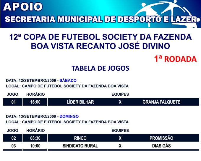 A Prefeitura de Rio Verde, por meio da Secretaria de Desporto e Lazer, apoia mais um campeonato que começa neste final de semana, 12 e 13: a 12ª Copa de Futebol Society da Fazenda Boa Vista, Recanto José Divino.