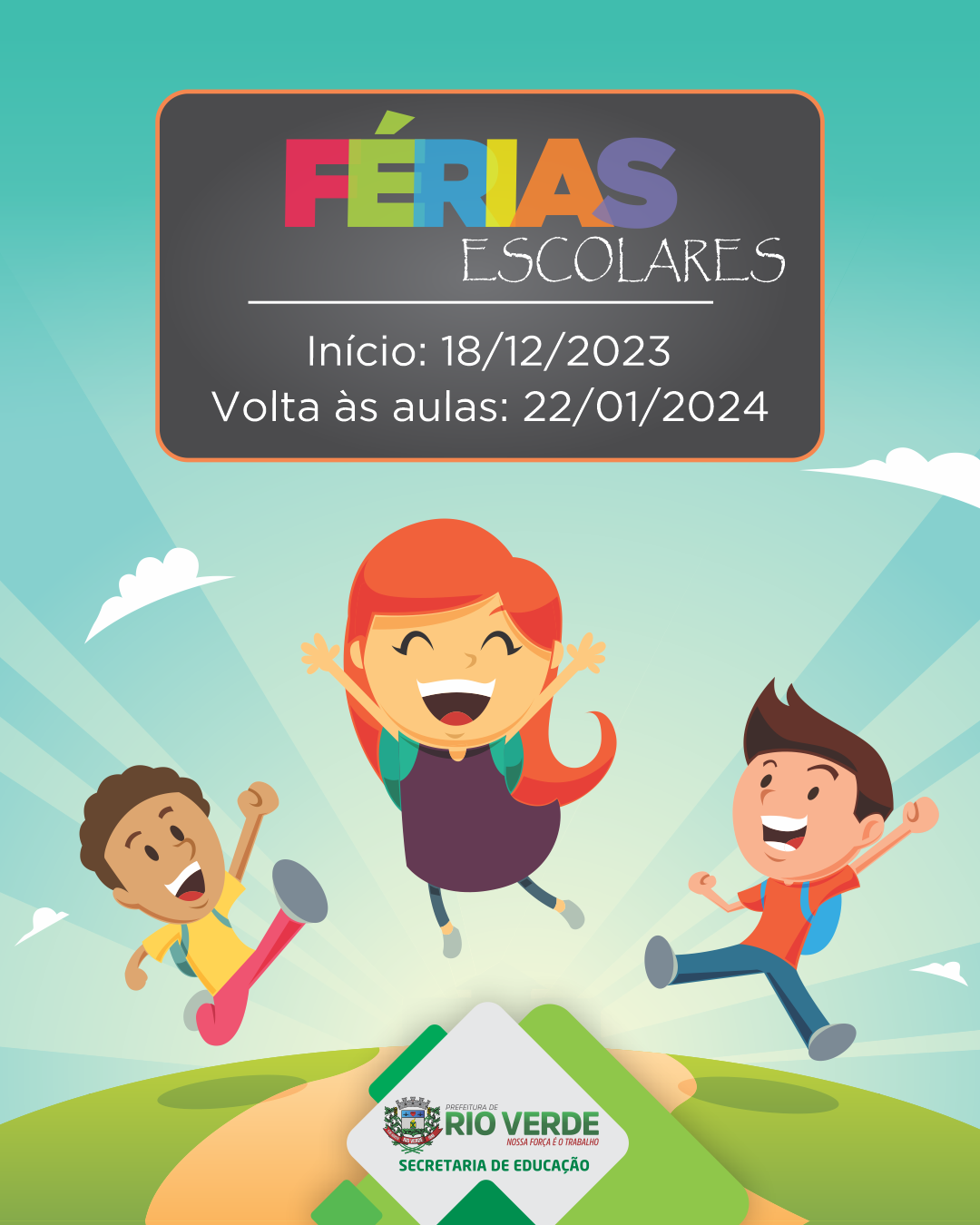 A Rede Municipal de Ensino encerra suas atividades do 2º semestre de 2023 nesta sexta-feira (15/12). Durante as férias, a Secretaria Municipal de Educação estará fechada para atendimento ao público, realizando serviços internos de 18/12 a 05/01/2024. Os atendimentos retornam normalmente no dia 08/01/2024 das 8h às 11h30 e das 13h às 17h30.Pais ou responsáveis que não participaram da chamada pública podem procurar a partir de 15/01, a secretaria da escola ou a central de vagas da educação pelos contatos: (64) 3602-8217 ou whatsapp: 99235-8110.Aproveitamos para desejar a todos um excelente período de férias!