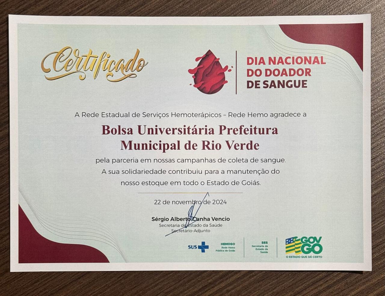 Hoje, 25 de novembro, Dia Nacional do Doador de Sangue, o Hemocentro de Rio Verde realizou uma cerimônia de homenagem às instituições que se destacaram na doação de sangue. A Secretaria Municipal de Assistência Social, liderada pela primeira-dama e secretária Lillian Garcia Martins do Vale, recebeu um certificado em reconhecimento ao impacto do programa Bolsa Universitária. O programa é o maior colaborador na captação de doadores, beneficiando não apenas Rio Verde, mas também todo o estado. A homenagem foi recebida pela Superintendente Técnica, Edilene Alves, que representou a secretária.Só neste ano, mais de 2 mil alunos do programa Bolsa Universitária participaram como doadores, fortalecendo os estoques do Hemocentro. A Secretaria Municipal de Saúde também foi reconhecida pelo trabalho realizado por meio das duas UPAs, do Hospital Municipal Universitário e do Materno Infantil, que promoveram campanhas de incentivo à doação de sangue ao longo do ano.As homenagens destacam a importância do engajamento coletivo para salvar vidas.