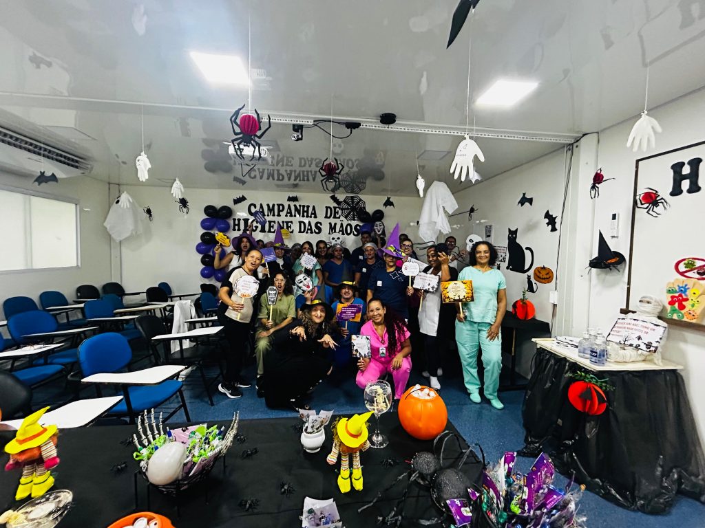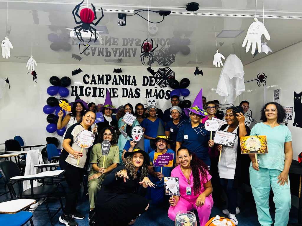 Nos dias 24 e 25 de outubro, o Hospital Municipal Universitário de Rio Verde promoveu uma ação especial para conscientização sobre a higienização das mãos, com uma abordagem temática de Halloween. Organizado pelo Serviço de Controle de Infecção Relacionado à Assistência à Saúde (SCIRAS), sob a coordenação da enfermeira Max Suelen, o evento integra o treinamento institucional de Higiene de Mãos, atendendo às normas da Agência Nacional de Vigilância Sanitária (Anvisa) e reforçando a execução do Protocolo de Higiene de Mãos do Hospital.
