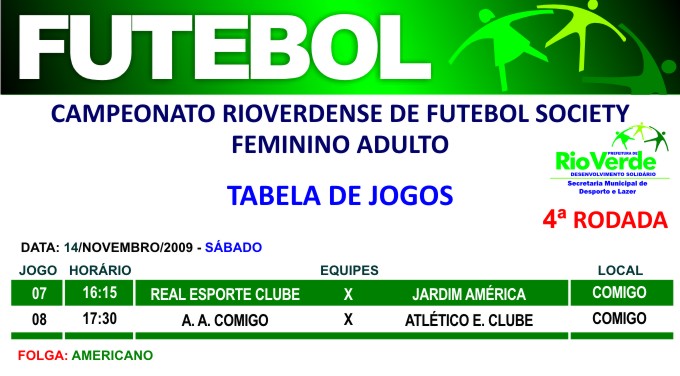 A Prefeitura de Rio Verde, por meio da Secretaria de Desporto e Lazer, realiza neste final de semana, a 4ª rodada do Campeonato Rio-verdense de Futebol Society – Feminino Adulto.