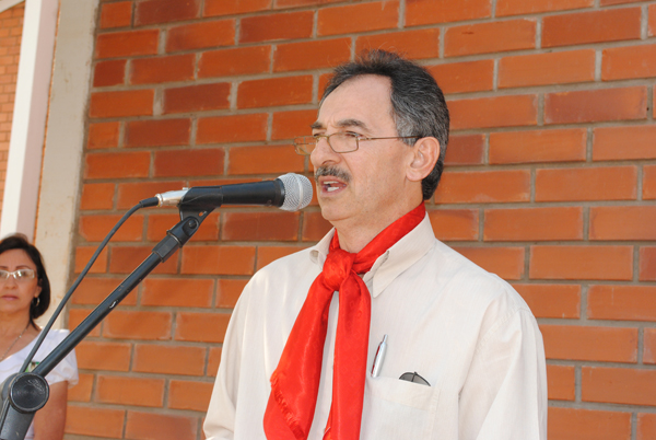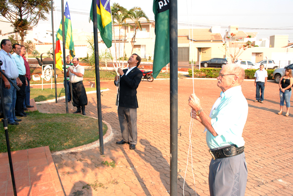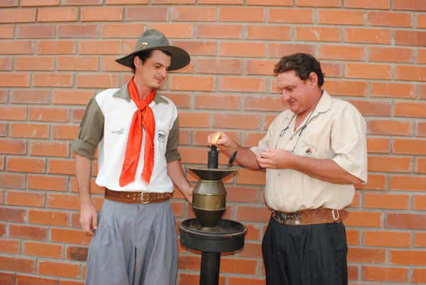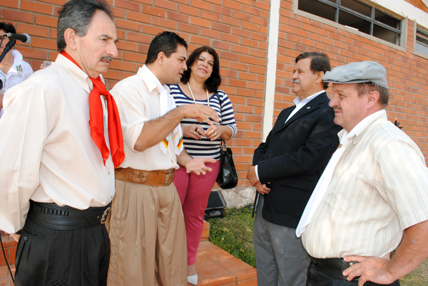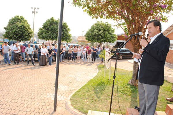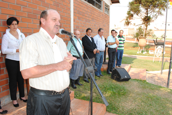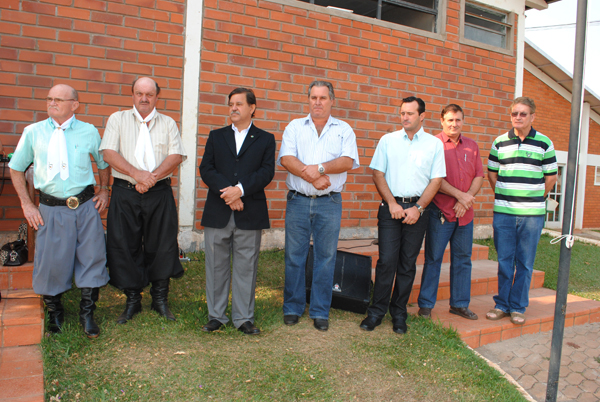 O prefeito Juraci Martins participou na manhã desta terça-feira, 14, da solenidade de abertura das Comemorações da “Semana Farroupilha” que aconteceu no Centro de Tradições Gaúchas (CTG). Esteve presente no evento o prefeito Juraci Martins, a secretária de Turismo Lúcia Michalczyk, o diretor de Desporto e Lazer Fernando Cézar Pazotti, Almo Schinaider primeiro patrão do CTG em 1988 e o Padre Olavo. No cerimonial o produtor rural Sadi Secco contou a história das Farroupilhas seus ideais, cidadania e revolução. As autoridades foram convidadas para participar do hasteamento das bandeiras através do hino nacional seguido pelo hino do Rio Grande do Sul. O Prefeito fez uso da palavra cumprimentando os presentes e aproveitou para brincar com os sulistas. “Vou aprender a tomar chimarrão”. Em discurso Juraci destacou o nome de grandes representantes do movimento farroupilha ressaltando sua importância e liderança, dentre eles Bento Gonçalves e Guiseppe Garibaldi. “Gosto muito de leitura e leio sempre, tenho grande satisfação em ler sobre histórias como essas, hoje pode-se observar a mudança das armas pela força do trabalho e da tradição gaúcha, que é muito forte, pelos resultados na economia, dedicação e por manter firme a tradição”. Declarou o Prefeito. Em declaração o Padre Olavo destacou a importância da festa dizendo que é uma grande tradição de fé política e trabalho. “Para nós é um testemunho de vida, por manter acesa há tanto tempo suas tradições”. Em seguida todos foram convidados a participar do tradicional café campeiro. A programação da Semana Farroupilha começou hoje e vai até o dia 20 de setembro com uma extensa programação. Fotos: Washington Oliveira Sadi Secco é responsável pelo "Chiru das falas" nome dado a função do cerimonialista Juraci Martins fez o hasteamento da bandeira brasileira "Chama Criola" é acesa representando os 175 anos da comemoração Farroupilha Juraci Martins posa juntamente com autoridades O Prefeito parabenizou a todos os sulistas por manter forte essa tradição Silvio Wegner, patrão do CTG de Rio Verde Vestidos a cárater, gaúchos fazem questão de contar suas histórias ao Prefeito da cidade Convidados participam do tradicional café campeiro