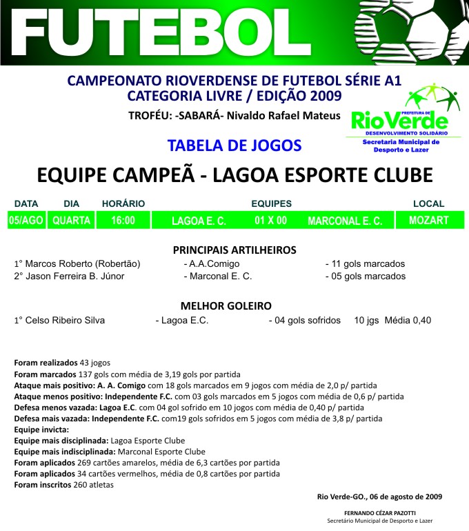Fazendo parte das comemorações dos 161 anos de Rio Verde, a Prefeitura, por meio da Secretaria de Desporto e Lazer, realizou a final do Campeonato de Futebol Série A1. O prefeito Juraci Martins e demais secretários municipais participaram do jogo, dando o ponta pé inicial da partida.