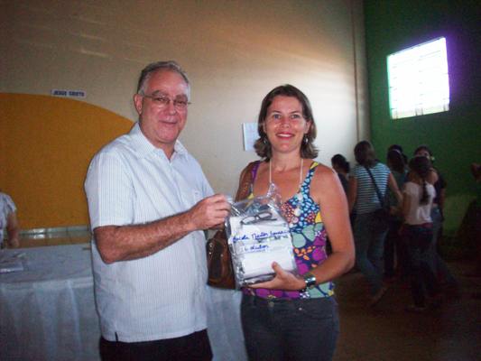Diretora da escola Nelson Fonseca recebe os óculos das mãos do secretário.