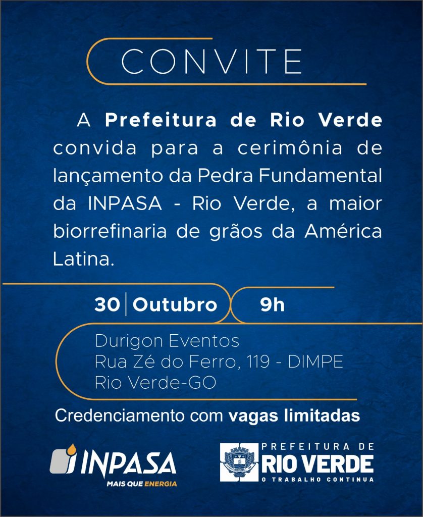 Confirmação de presença: https://www.sympla.com.br/evento/cerimonia-pedra-fundamental-inpasa-rio-verde/3172614. Utilize o código de convite: IMPGO40INP