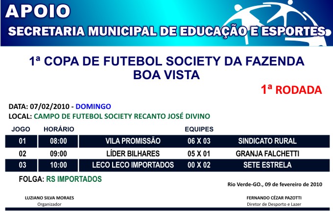 A Prefeitura de Rio Verde através da Secretaria de Educação e Esportes, realizou neste domingo, 07, a primeira rodada da Copa de futebol Society da Fazenda Boa Vista, os jogos foram realizados no Campo de futebol Society " Recanto do José Divino".