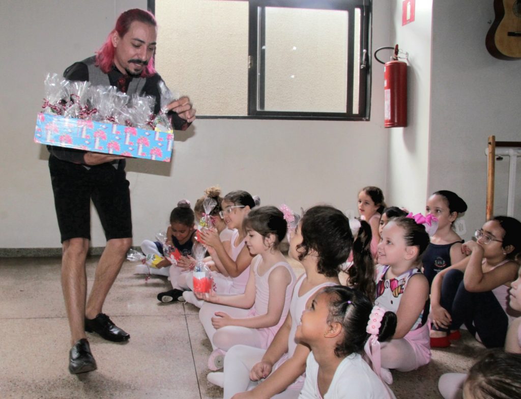 Nesta segunda-feira (10), a programação foi iniciada com alunas do balé, na Biblioteca Municipal Rosulino Campos. As crianças foram surpreendidas pelo ator e contador de histórias Carlos Petrick, que arrancou diversas gargalhadas das meninas.