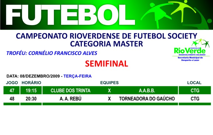 A Prefeitura de Rio Verde, por meio da Secretaria de Desporto e Lazer, realizou neste final de semana, a semi-final do Campeonato Rio-verdense de Futebol Society – Master.