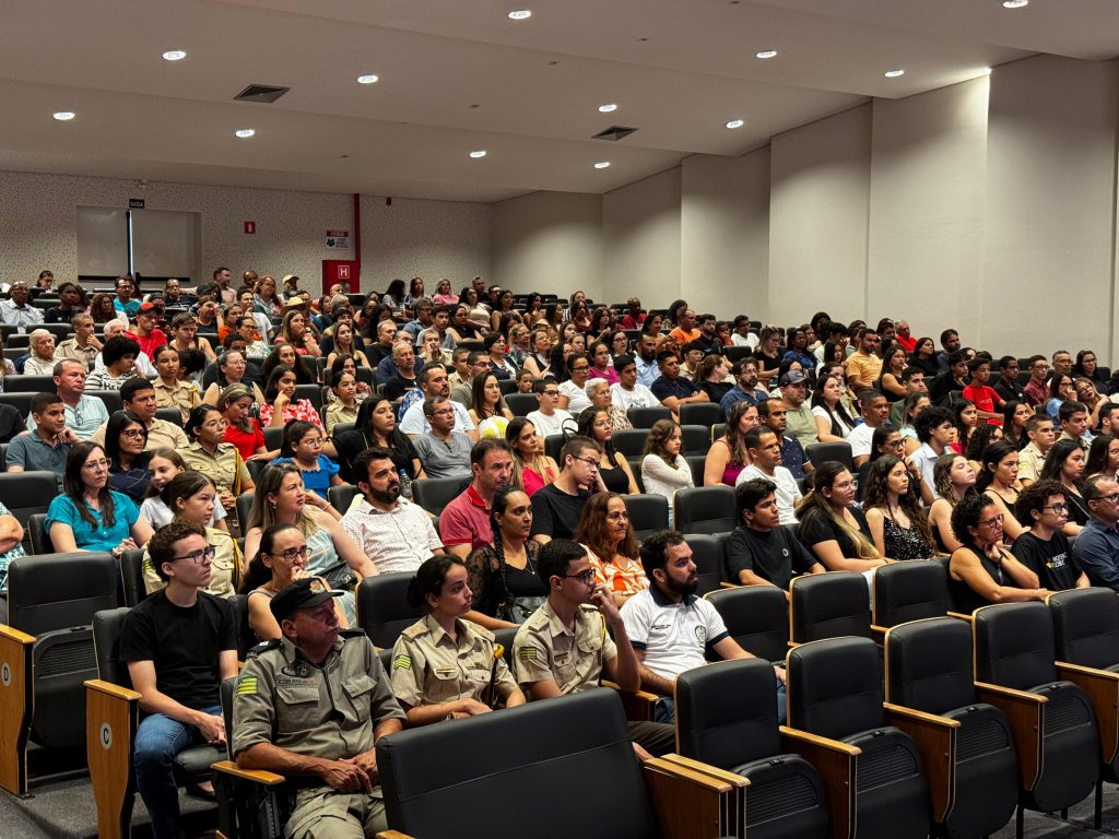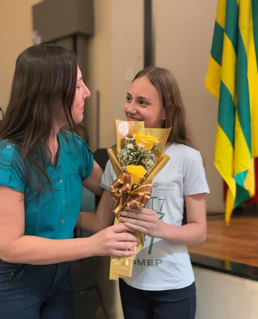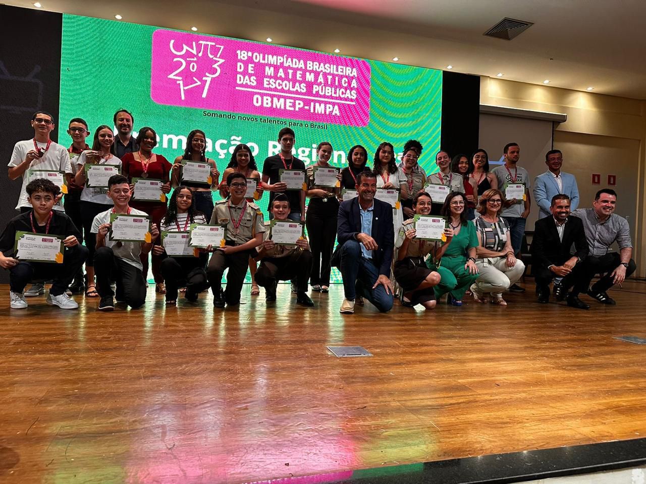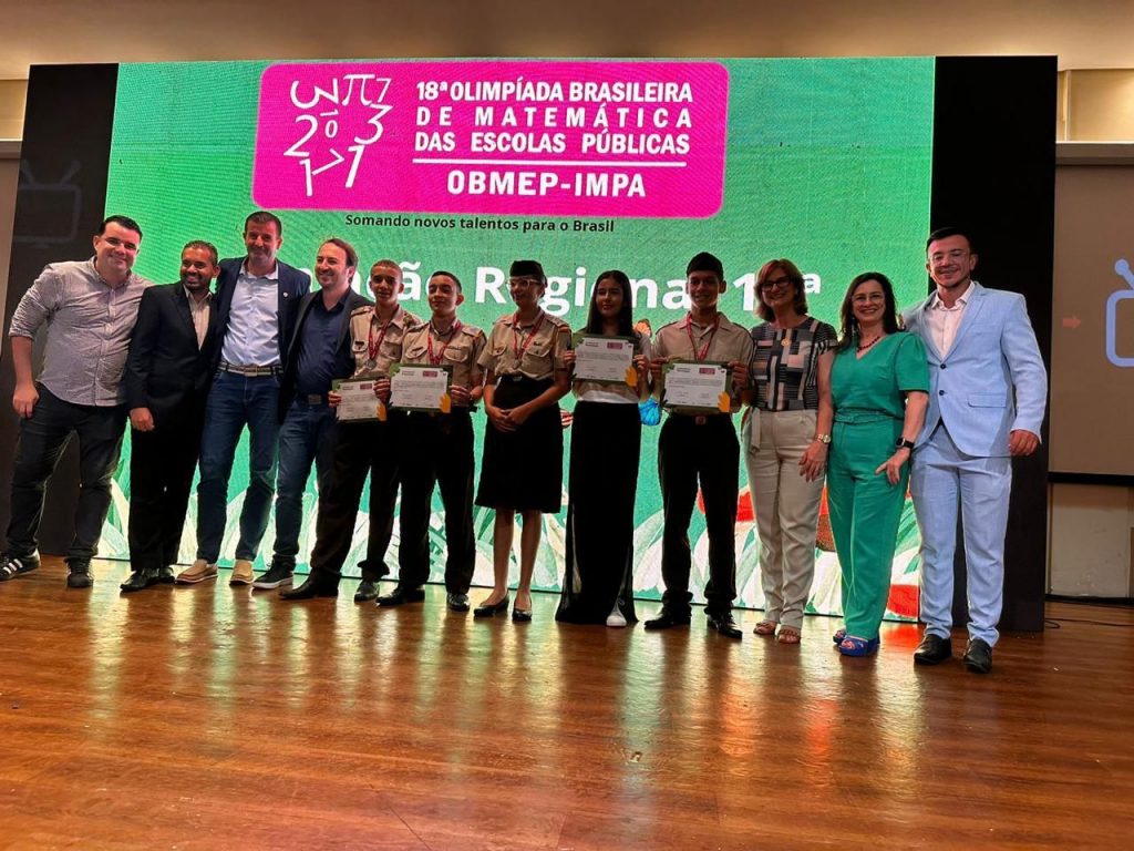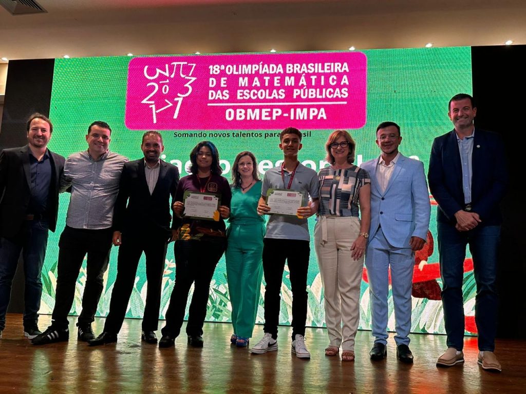 Na última terça-feira, (10/12), o Teatro Lauro Martins foi palco da cerimônia regional de premiação da 18ª Olimpíada Brasileira de Matemática das Escolas Públicas (OBMEP). O evento reuniu estudantes, professores e famílias de toda a região para celebrar o talento e a dedicação de jovens brilhantes que se destacaram na competição!Os destaques das nossas escolas municipais foram:Hauder César Faria Filho (EMEF Luiz Alberto Leão): Medalha de ouro regional e já consagrado com ouro nacional!Amanda Baldin Ponte (EMEF Luiz Alberto Leão): Medalha de prata regional e bronze nacional.Levi Sena Santos (EMEF Selva Campos): Medalha de bronze regional.Emily Maria Costa de Morais (EMEF Antônio Gomes de Lima): Medalha de bronze regional.Além das medalhas, nossos alunos conquistaram 14 menções honrosas, mostrando a força da educação pública de Rio Verde e a dedicação dos nossos professores.O evento contou com a participação do Fernando Ricardo Moreira – Coordenador Regional da OBMEP e Professor da UFJ, Carmen Rejane Antunes – Superintendente Administrativa Pedagógica da Secretaria Municipal de Educação, Wender José de Souza – Coordenador do Profmat; Dioscoros Brito Aguiar Júnior – Coordenador do Curso de Matemática; Gecirlei Francisco da Silva – Professor da UFJ; Christiano Peres Coelho – Reitor da UFJ.