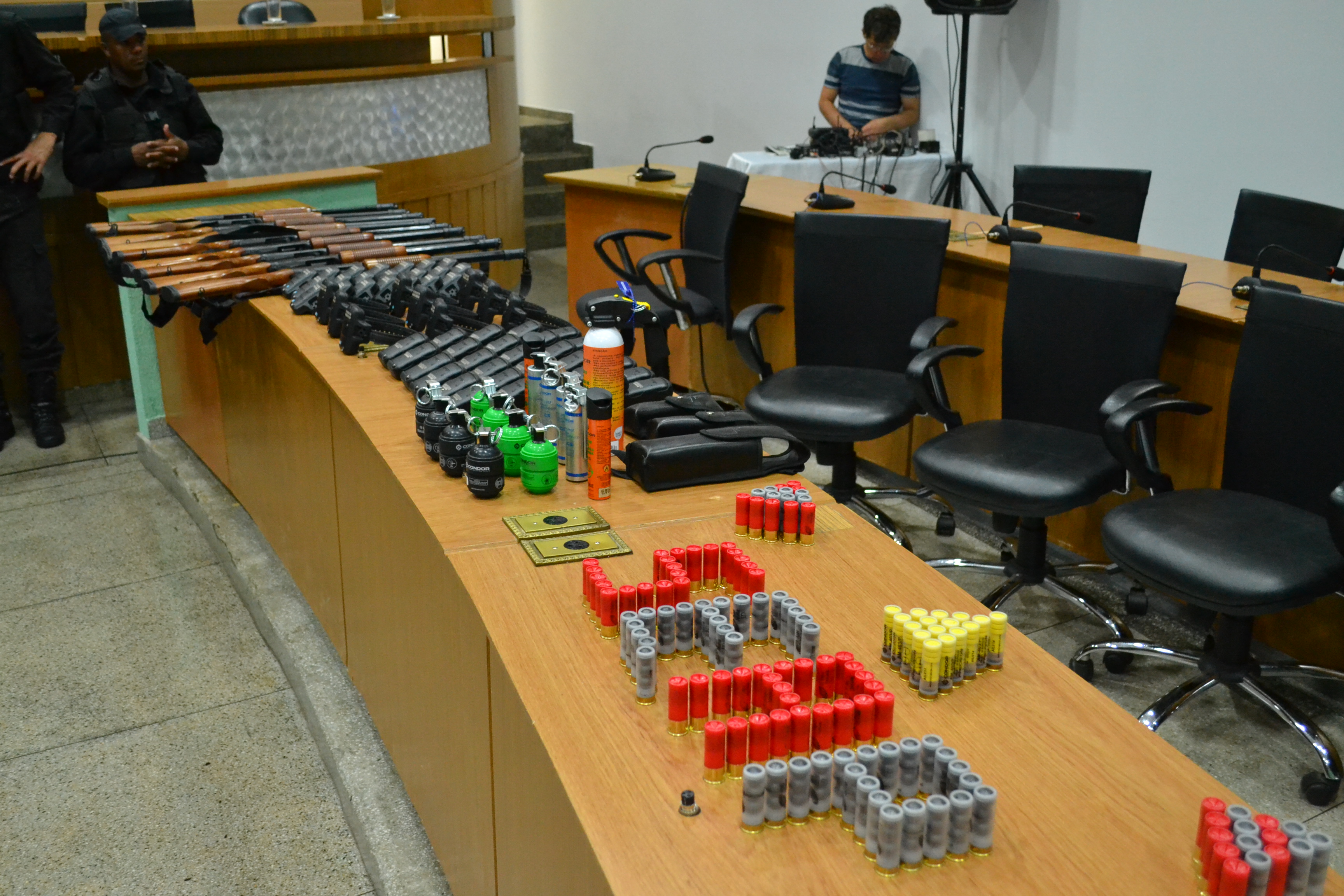 Foram entregues aproximadamente 150 itens adquiridos pelo Governo do Estado, dentre eles tornozeleiras eletrônicas, 70 espingardas calibre 12, 150 detectores de metais tipo baqueta, munições letais e não letais, granadas de pimenta, luz e som, granadas lacrimogêneas e sprays de pimenta, entre outros.