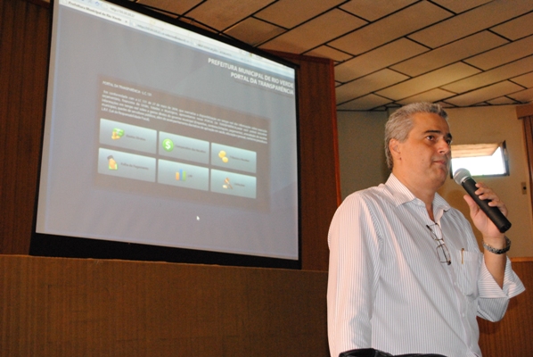 Visando cumprir a legislação que exige clareza nas contas do poder público, a Prefeitura de Rio Verde sai na frente de vários outros governos e implanta o portal da transparência, que exibe informações de todos os setores do governo. Nesta quinta-feira, 10, a Prefeitura através da Secretaria de Administração realizou em seu auditório uma reunião com todos os secretários e gestores de governo para apresentar o novo programa desenvolvido pelo sistema de gerenciamento de informática da Prefeitura – Prodata. A primeira parte da apresentação ficou por conta do secretário de Administração, José Carlos Pimenta que destacou a importância de que todos os gestores tenham acesso ao sistema para poder contribuir com as informações necessárias na sua atualização real. Alinhados com a política de governo do prefeito Juraci Martins que tem por objetivo integrar população e administração, o sistema criado tem como chave fundamental a prestação de contas e a direta participação na gestão do município. Segundo Wagner Lobo, coordenador do Prodata, vários municípios estão seguindo o exemplo de Rio Verde e tentando aprender como desenvolver um sistema eficiente. “Transparência e eficácia na gestão pública torna-se cada vez mais uma exigência do cidadão, bem como das instituições fiscalizadoras (Tribunal de Contas do Município)”, afirmou Wagner. Fotos: Danglarys José Wagner Lobo apresenta a todos as inovações do Portal da Transparência Secretários e gestores aprendendo as novidades do sistema desenvolvido "Cada vez mais o cidadão exige prestação de contas do poder público", afirmou Wagner