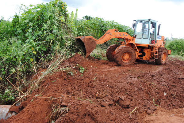 Com um total de 250 metros, a extensão irá resolver um antigo problema que persistia no local. Em períodos chuvosos, parte da pista ficava tomada pela água causando grande transtorno aos motoristas e aumentando a chance de acidentes.   Para a viabilização do trabalho está sendo necessário fazer uma drenagem através de um colchão de pedras basálticas depositadas no fundo da vala. Todo esse processo está envolvendo diversos operários, uma pá carregadeira e uma retroescavadeira.                                    Fotos: Washington Oliveira Pá carregadeira abrindo caminho frente a vegetação   Por causa da humidade do terreno está sendo aplicado um sistema de drenagem   Material utilizado para a construção da rede